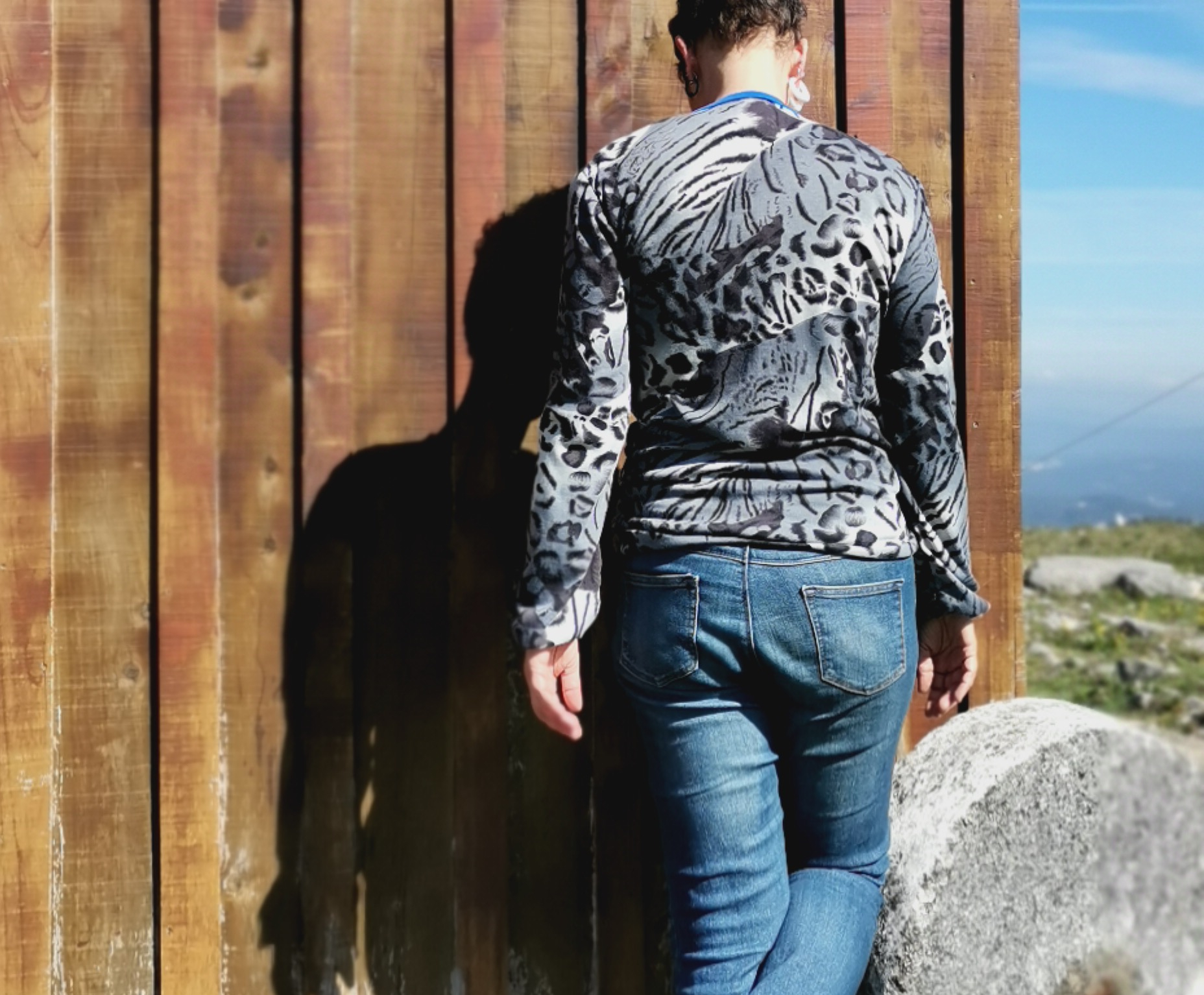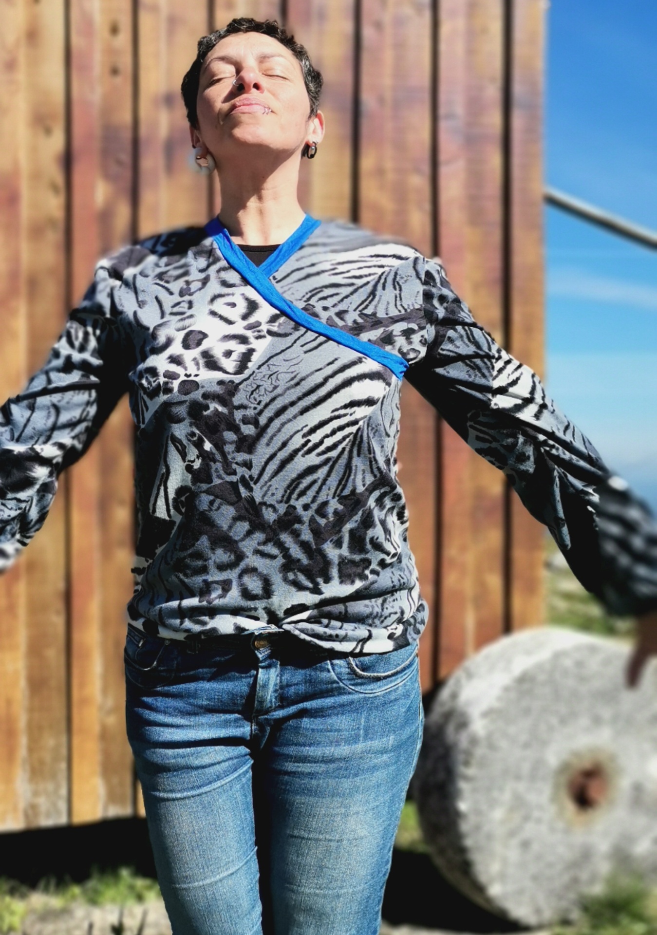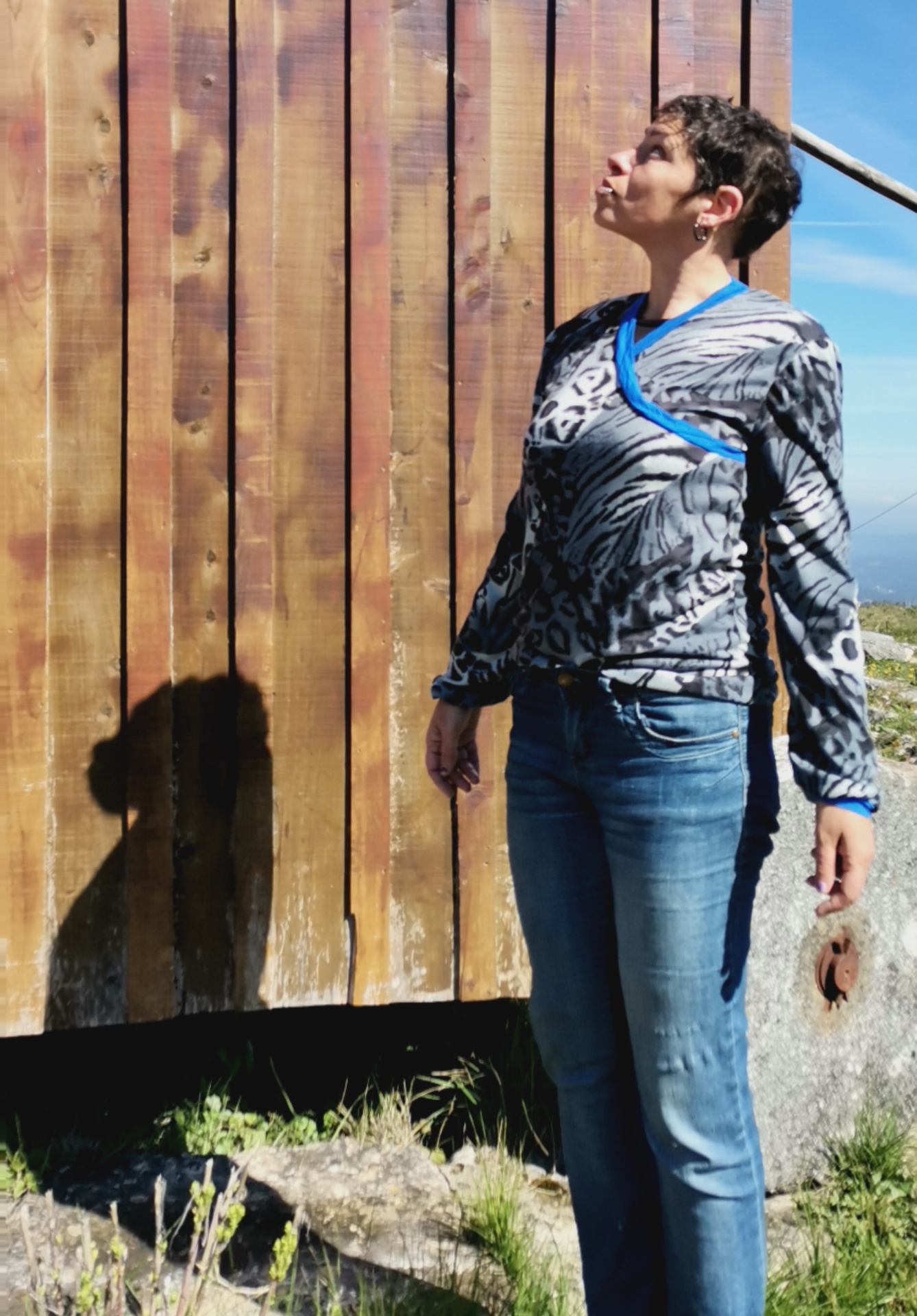 Camisola kimono, trespassada em malha azul e cinza, leve e macia