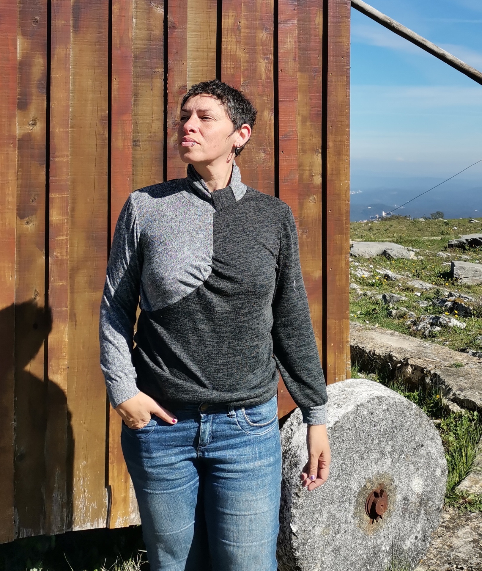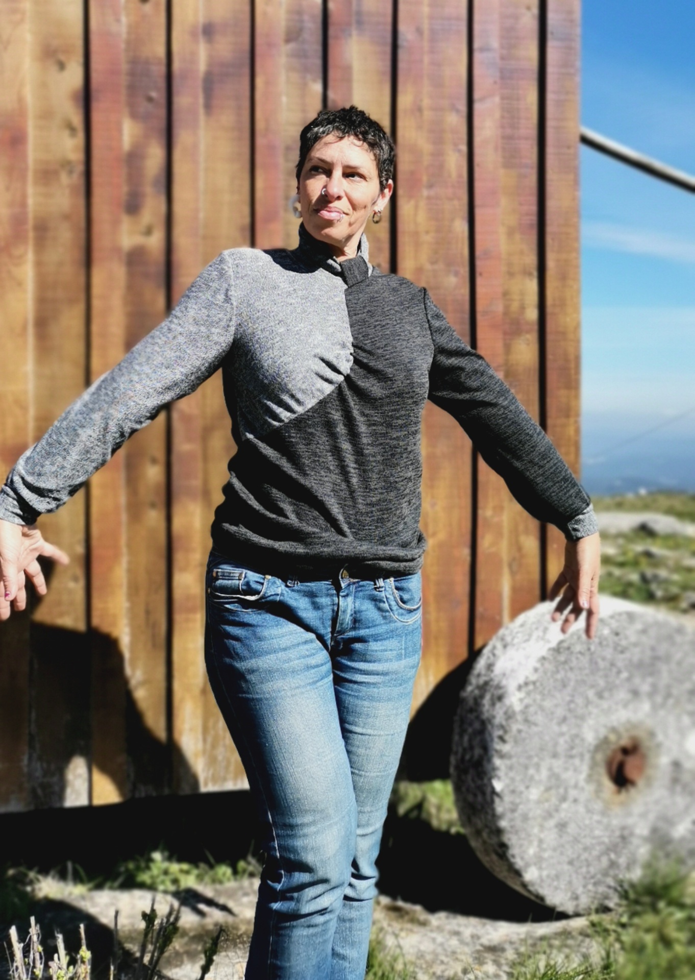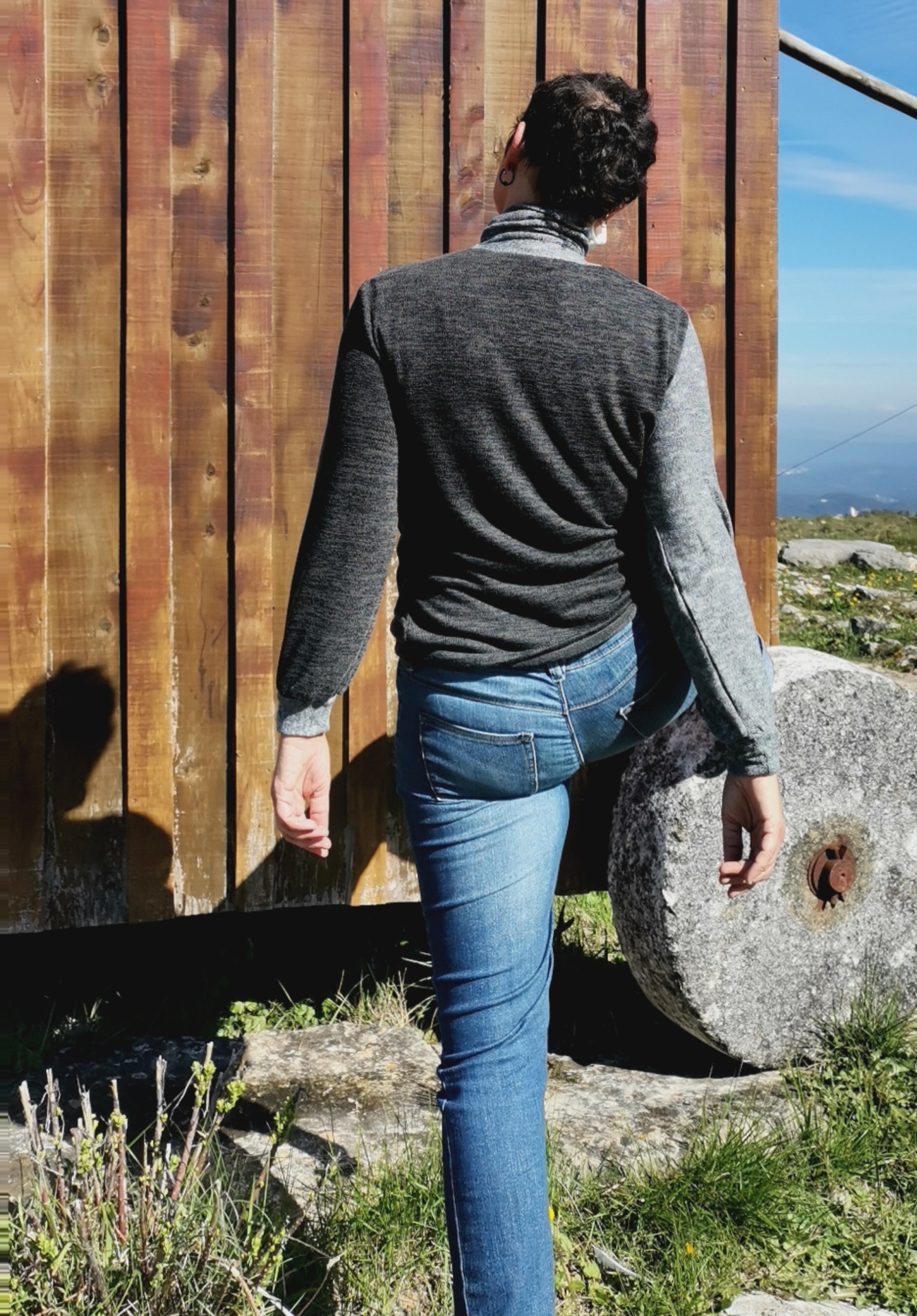 Camisola assimetrica, em malha cinza mesclada e verde tropa mesclada, gola alta
