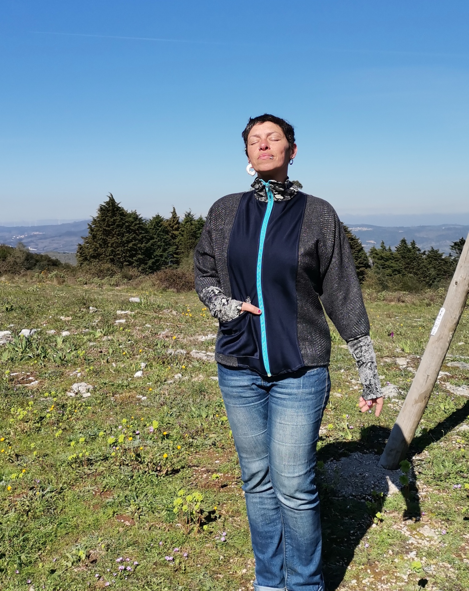 Em fazendas e borel com manga morcego, bolso exterior , gola e punhos um malha licra, fecho eclair