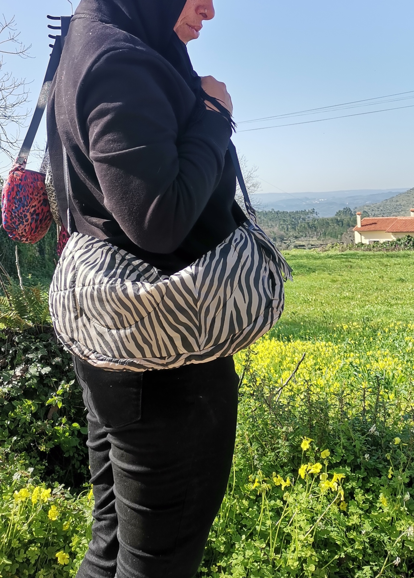 Mala tira-colo, feita de chapéus de chuva estagrados, acolchoada com bolso interior