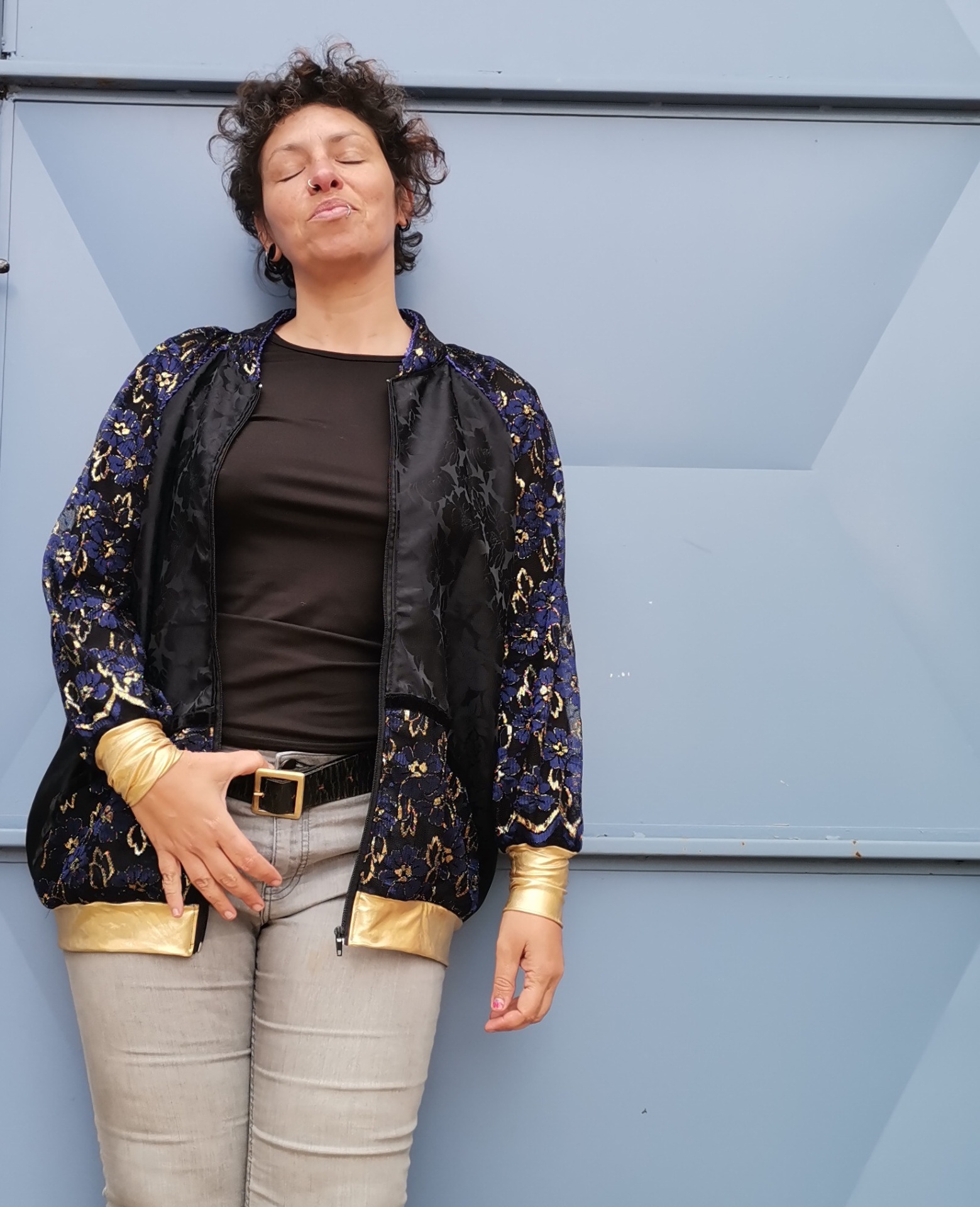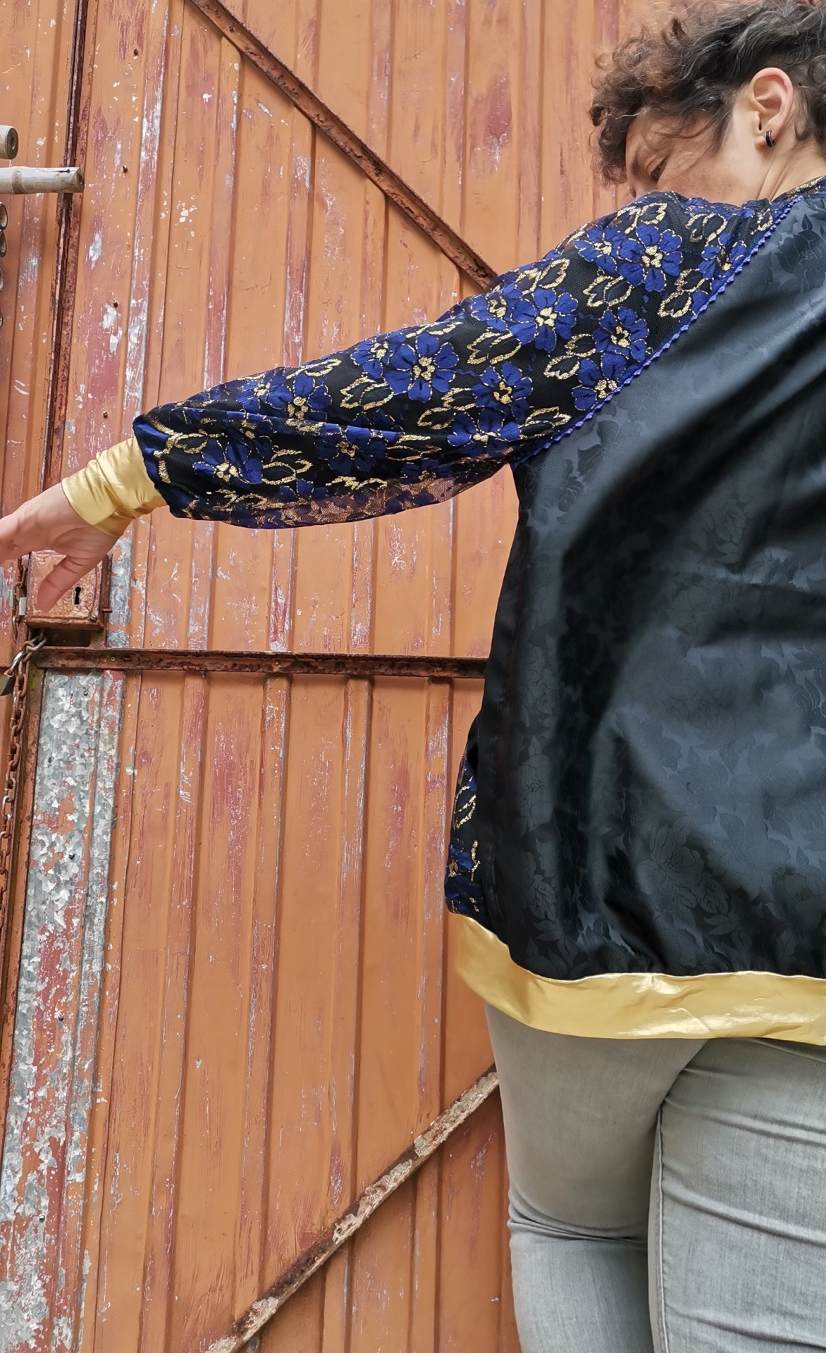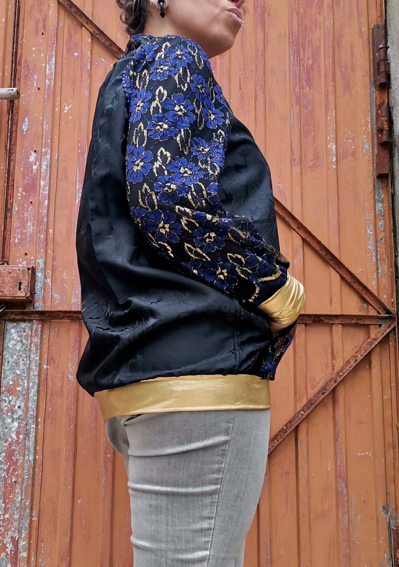 Casaco com mangas raglan em renda preta azul e dourado com motivos florais e vivo anil nas costuras das mangas, fecho e gola. Cós e punhos em licra dourada.gola em renda .