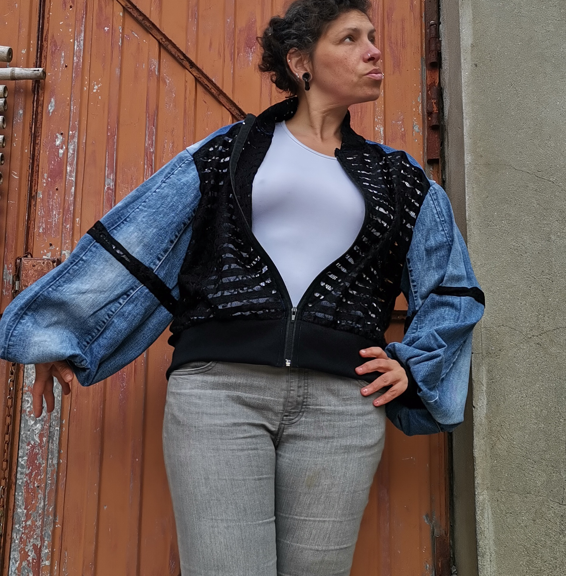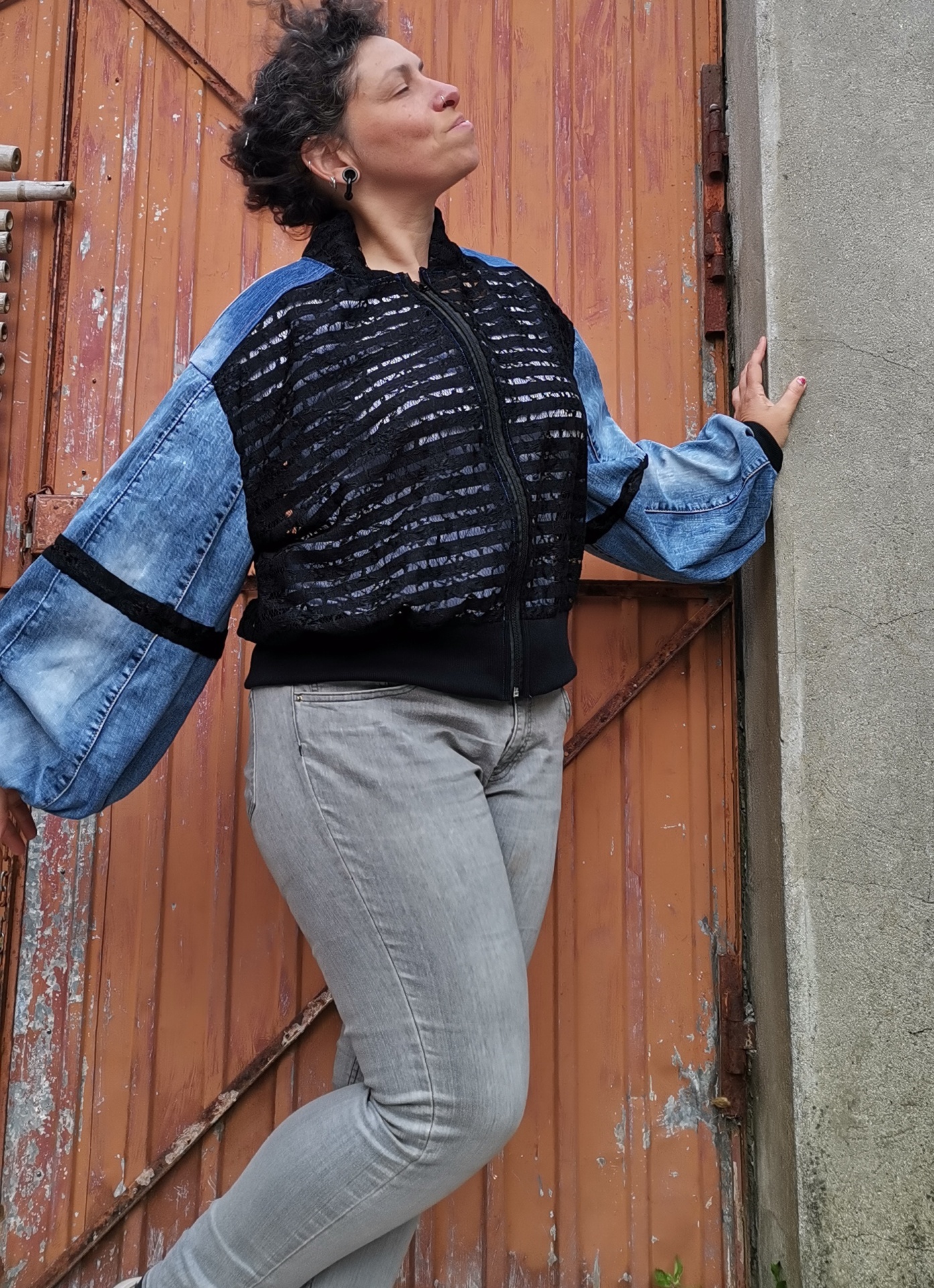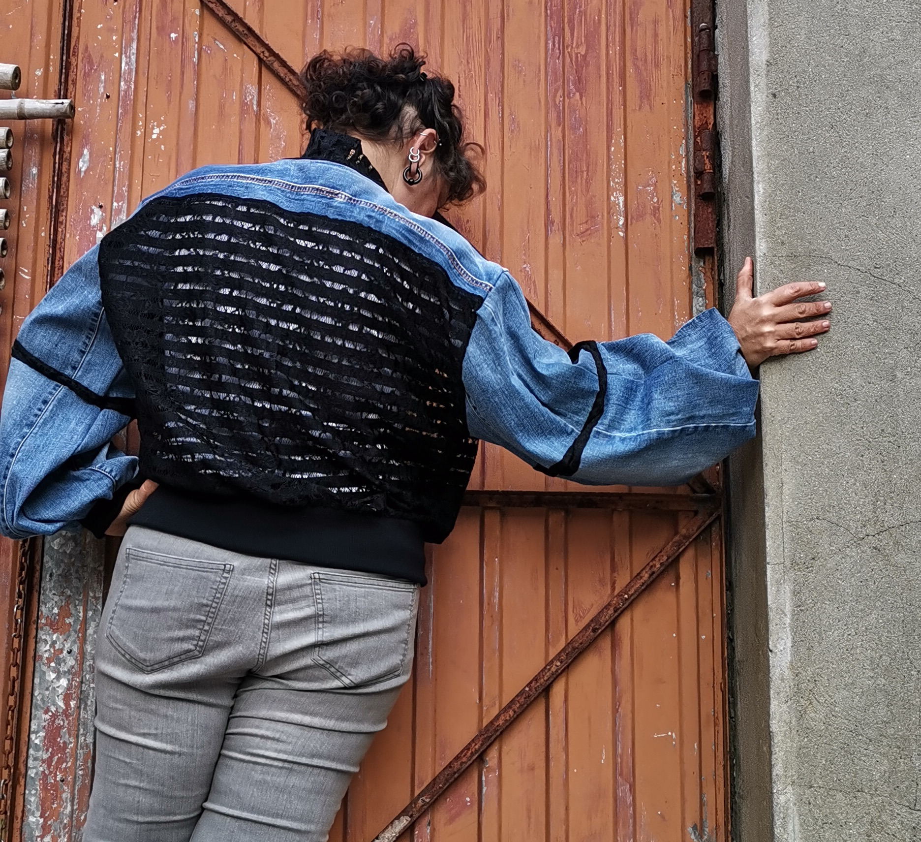 Cacaco com manga balão, em ganga e promenor em renda, corpo com  escapulário em ganga , corpo em renda preta com motivo riscas, gola em renda